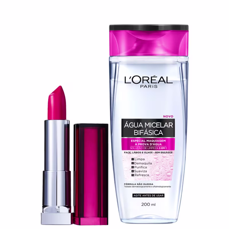 Kit Maybelline Amor Cor de Rosa também garante uma pele limpa e demaquilada sem dificuldades. A Água Micelar Bifásica não pesa e é muito eficiente para retirar até os produtos mais resistentes como lápis de olho e batom. Hidrata e refresca seu rosto.