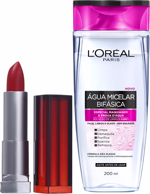 Kit Maybelline Pisca Alerta também oferece limpeza de pele simples e sem dificuldades. A Água Micelar Bifásica é líquida e retira até mesmo produtos resistentes e difíceis de retirar. Confere hidratação para a pele.