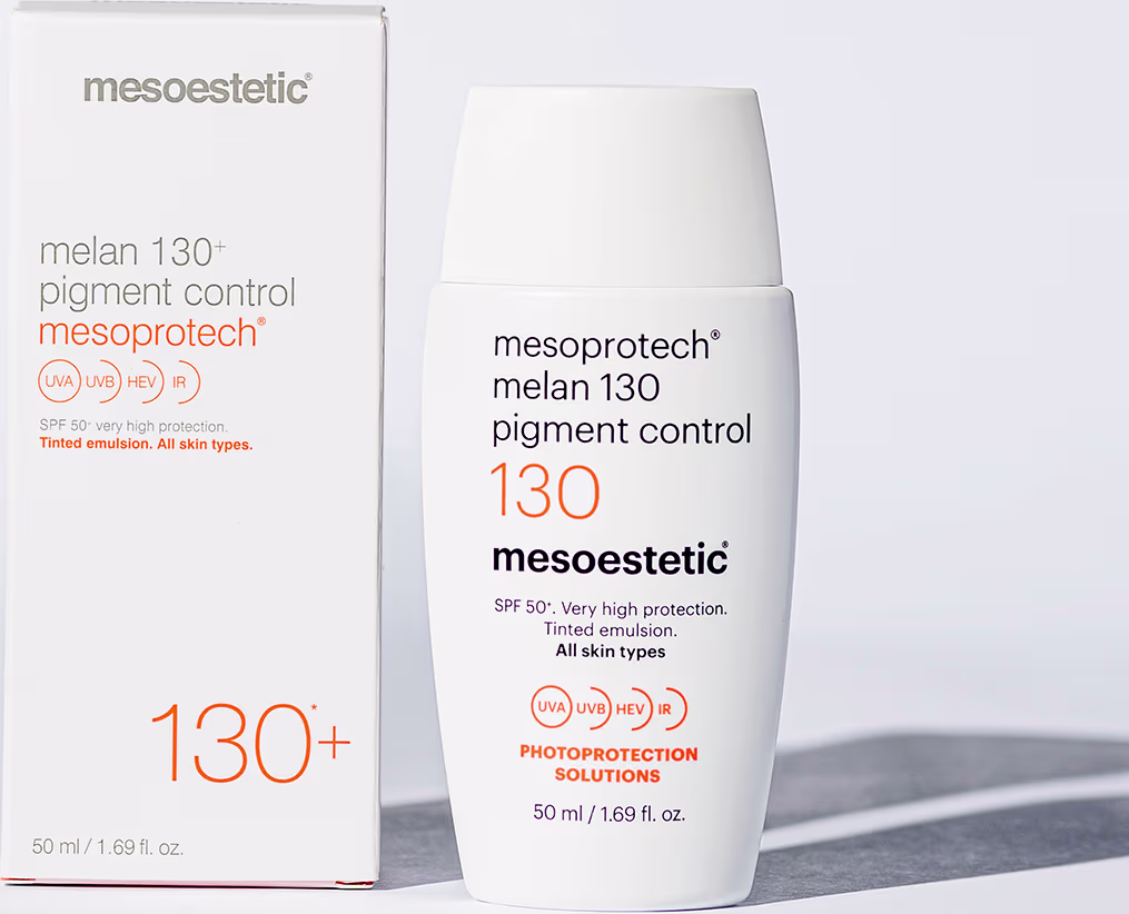 Mesoestetic Melan 130 FPS - Protetor Solar 50ml: potente filtro solar que não apenas protege a pele, com o maior fator de proteção do Brasil, como também ajuda no uniformizador das manchas. Isso porque sua fórmula inovadora contém azeloglicina, um ativo Uniformizador que previne as manchas causadas pelo sol e regula a enzima tirosinase, responsável pela produção de melanina.
