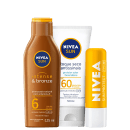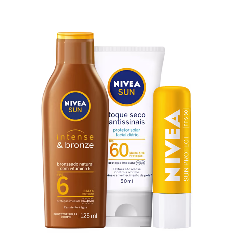 O Kit NIVEA Intense Bronze & Antissinais é a combinação ideal para quem busca alta proteção, combate aos sinais de envelhecimento precoce no rosto e um bronzeado dourado e duradouro para o corpo. Sem esquecer da hidratação e rejuvenescimento da pele dos lábios.