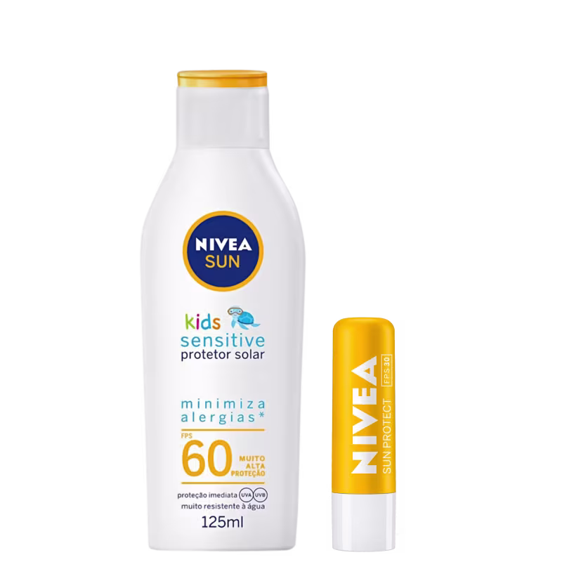 O Kit NIVEA Sun Kids Sensitive Protect conta com protetor solar de alta proteção, formulado especialmente para minimizar o surgimento de alergias relacionadas à exposição solar, além de sua ação ser resistente à água e suor. O hidratante labial completa protegendo e hidratando a pele dos lábios.