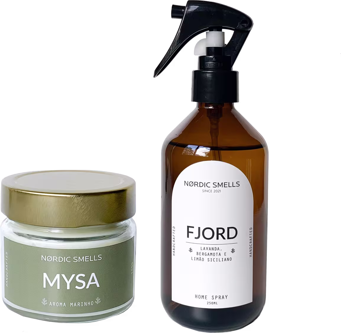Kit com uma vela aromática e um spray para ambientes. O Kit Nordic Smells Aroma Marinho, Lavanda, Limão Siciliano e Bergamota tem aromas que criam um ambiente relaxante e tranquilo.