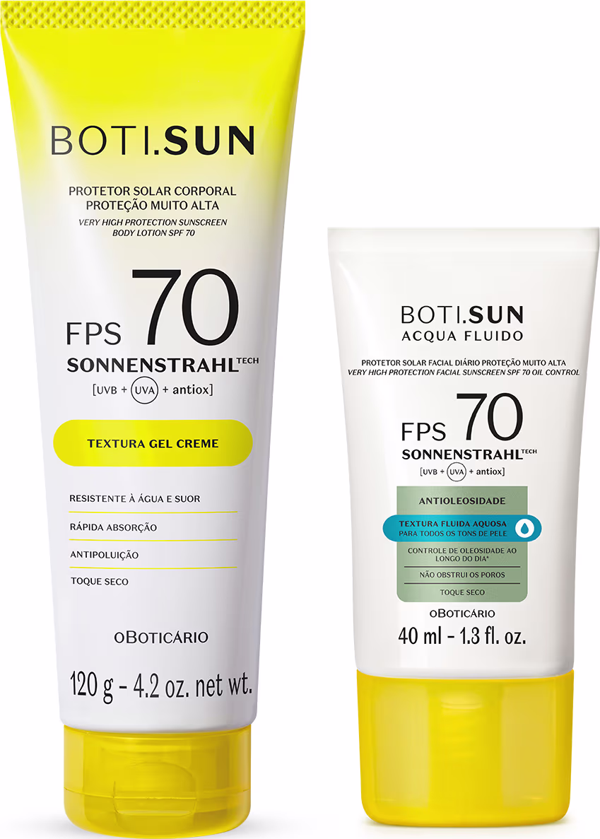 O Kit o Boticário Boti.Sun Facial e Corporal FPS 70 oferece o cuidado ideal para sua pele durante o verão ou em qualquer época do ano. Com um protetor solar para o rosto e outro para o corpo, este combo garante proteção eficaz contra os efeitos nocivos do sol, sem abrir mão de uma textura leve e um acabamento invisível: