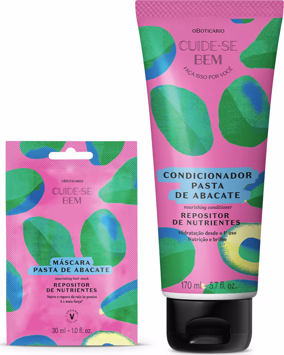 Kit com condicionador e máscara para cabelos danificados e ressecados. o Boticário Cuide-se Bem Feira Pasta de Abacate nutre e repara intensamente os fios.