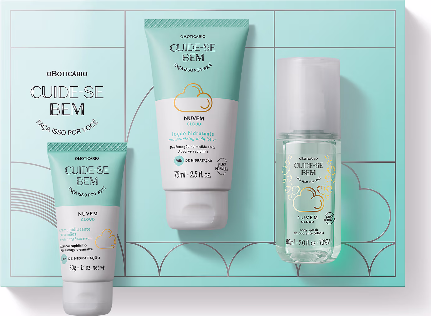 Kit com loção hidratante, creme hidratante para mãos e body splash. o Boticário Cuide-se Bem Nuvem Mini contém itens ideais para manter o momento de autocuidado.