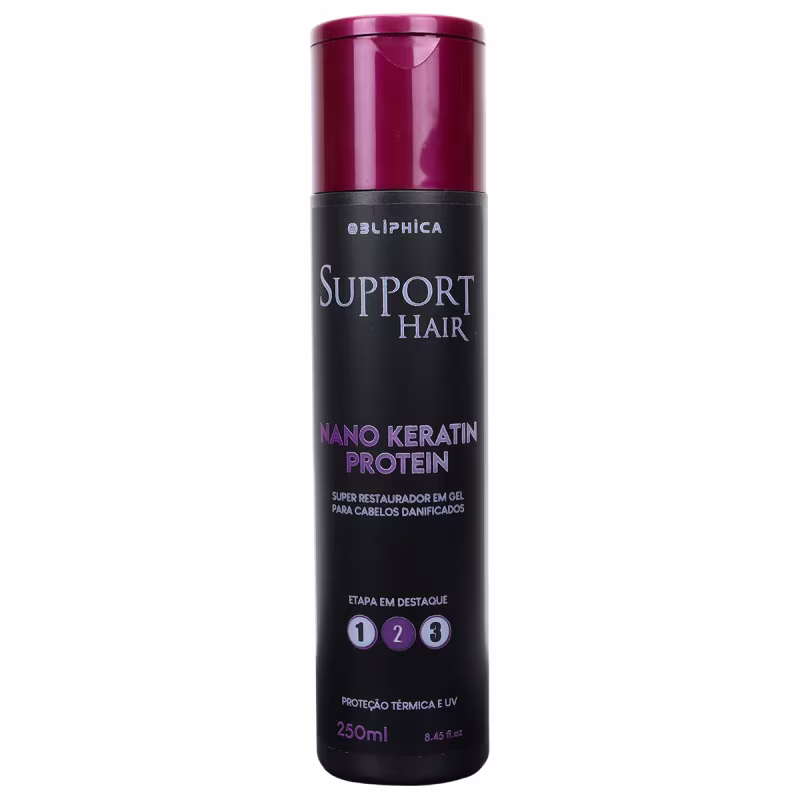 Obliphica Cosméticos Support Hair Nano Keratin Protein - Tratamento Capilar 250ml: um super restaurador em gel indicado para fios danificados e sensibilizados. Este produto age intensivamente na porosidade a fibra capilar e proporcionado mais resistência durante e pós procedimentos químicos no cabelo.