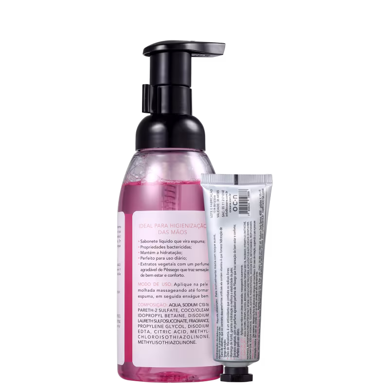 Kit com sabonete líquido e creme para as mãos. Ideal para todos os tipos de pele, o Kit Océane Bath & Body Pink Peach Hand limpa e hidrata suavemente.