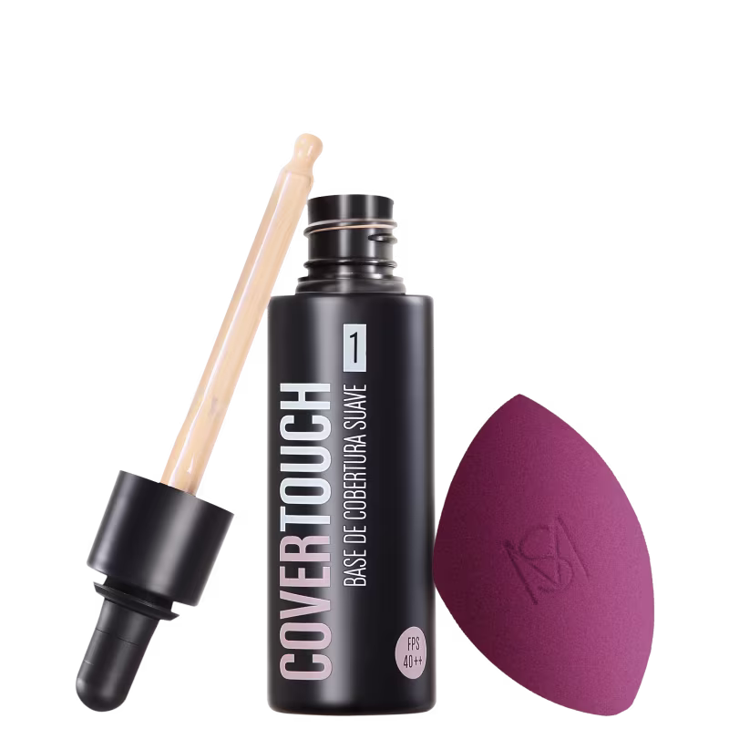 Kit com base líquida e esponja para maquiagem. Kit Océane Cover Touch Blend 1 uniformiza o tom com uniformidade por todo o rosto, inclusive nas áreas de difíceis acesso, além de proteger dos raios UV.