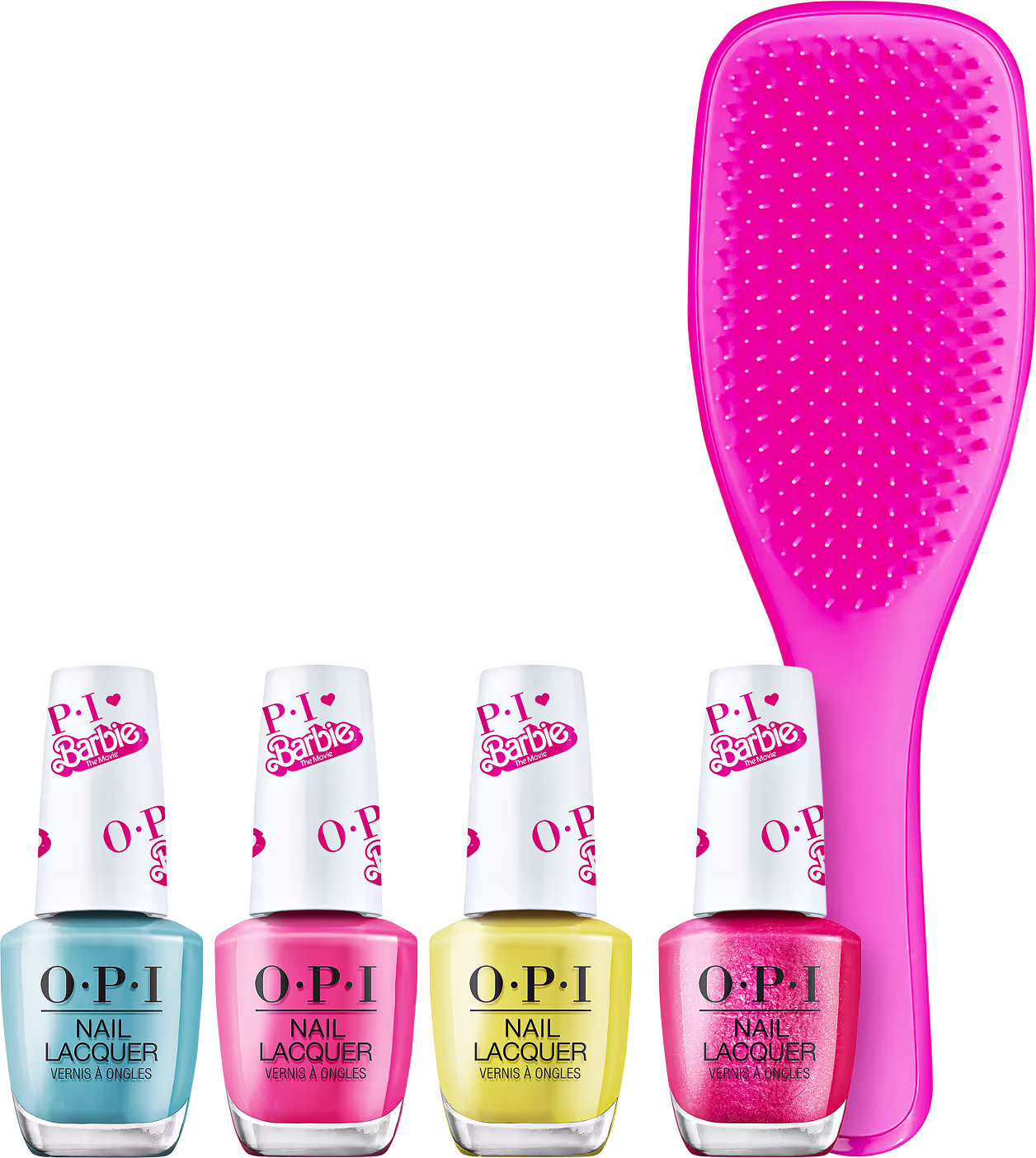 Kit com esmaltes e escova de cabelo. OPI Barbie + Tangle Teezer Wet Detangler Barbie Pink 7 uma coleção especial, inspirada no universo da boneca mais famosa da cultura pop.