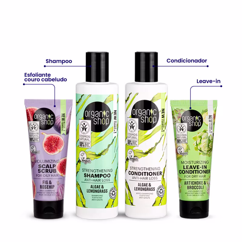 Kit de tratamento para cabelos com queda. Organic Shop Capim Limão Figo Alcachofra é ideal para fortalecer e revitalizar os cabelos nessas condições.