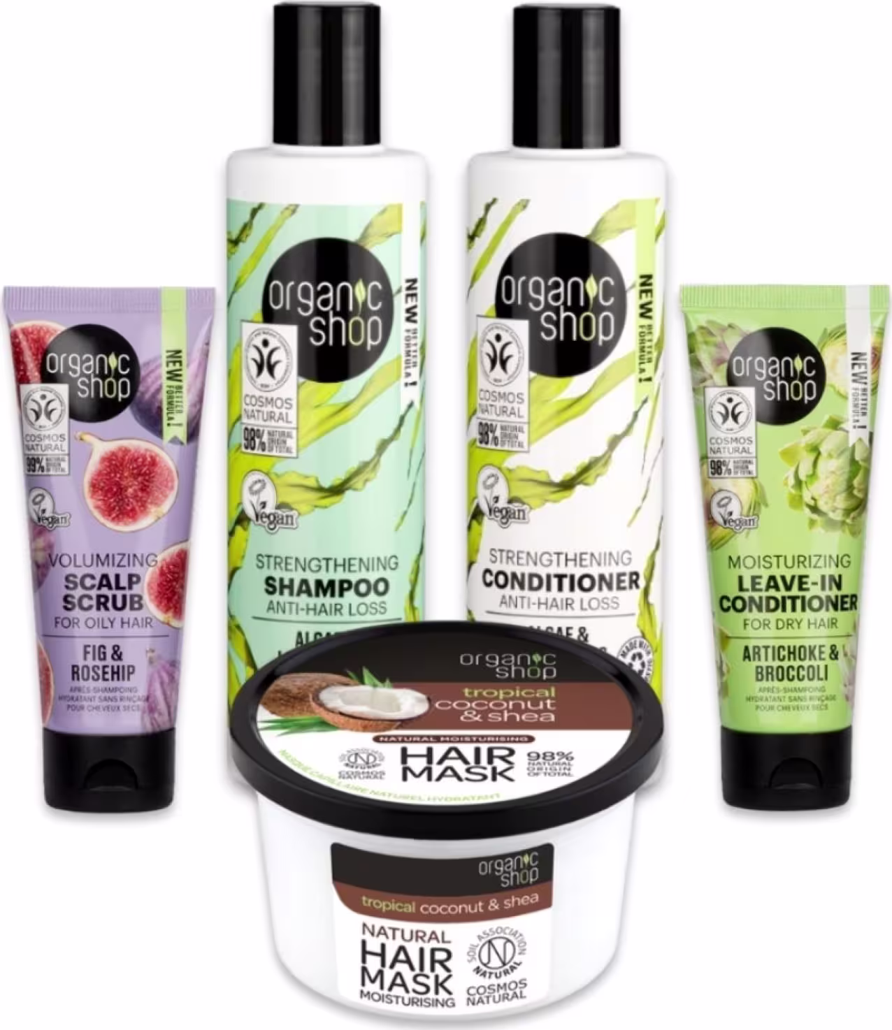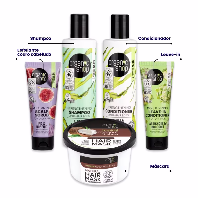 Kit de tratamento para cabelos com queda. Organic Shop Capim Limão Figo Coco Brócolis oferece o máximo de cuidado, garantindo cabelos fortes, saudáveis e livres da queda.