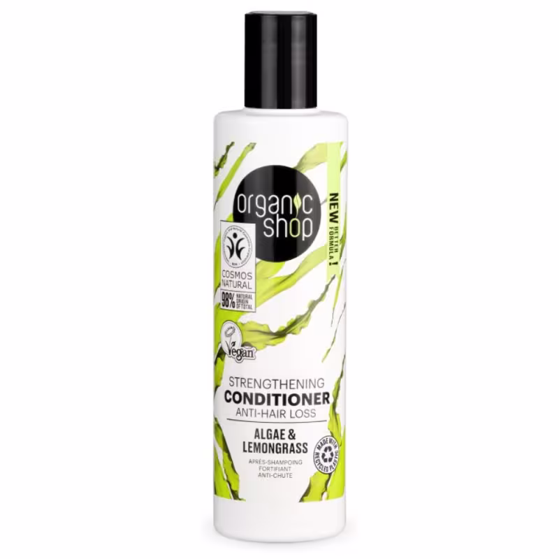 Organic Shop Capim Limão e Algas - Condicionador 280ml: trabalha para fortalecer os fios e suavizar a textura do cabelo, facilitando o desembaraço e reduzindo a quebra durante o penteado.
