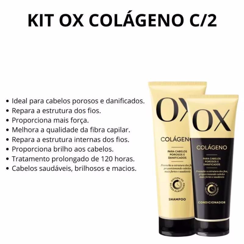 Kit OX Cosméticos Colágeno: com shampoo e condicionador para cabelos porosos e danificados. Melhores Kits da OX Cosméticos na BLZ. Ver mais ❯