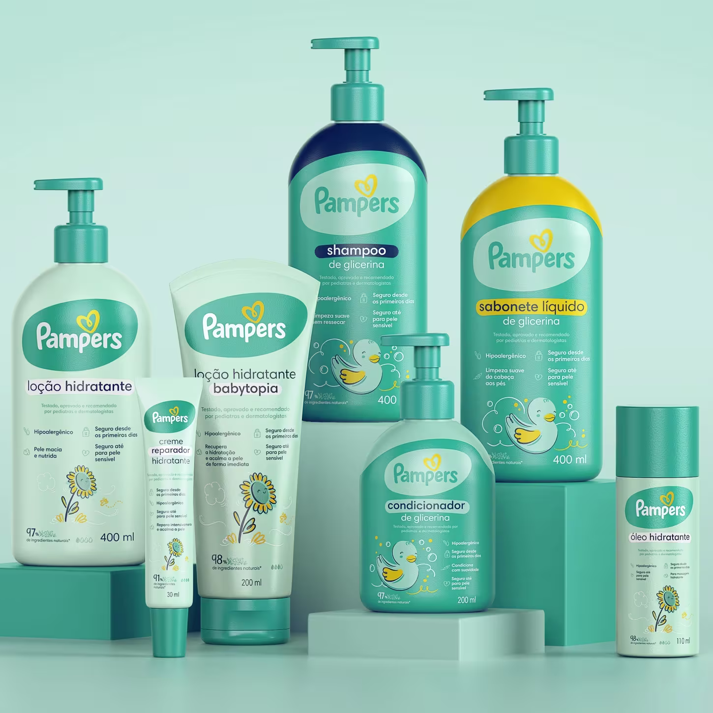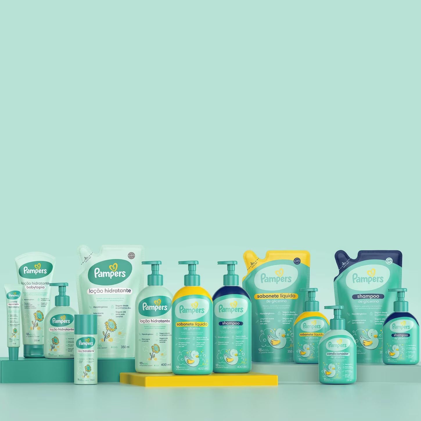 Kit de corpo e banho infantil para todos os tipos de pele e cabelos. Pampers garante uma rotina completa de higienização e cuidado.