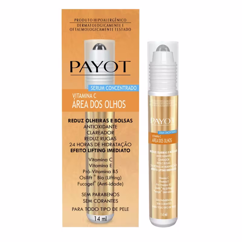 Payot Vitamina C - Sérum Redutor de Linhas para Área dos Olhos 14ml: com efeito lifting imediato, foi desenvolvido especialmente para suavizar linhas de expressão e remodelar o olhar, complementando os benefícios antirradicais livres do Complexo Vitamina C, deixando a pele protegida, revitalizada e com 24 horas de hidratação.