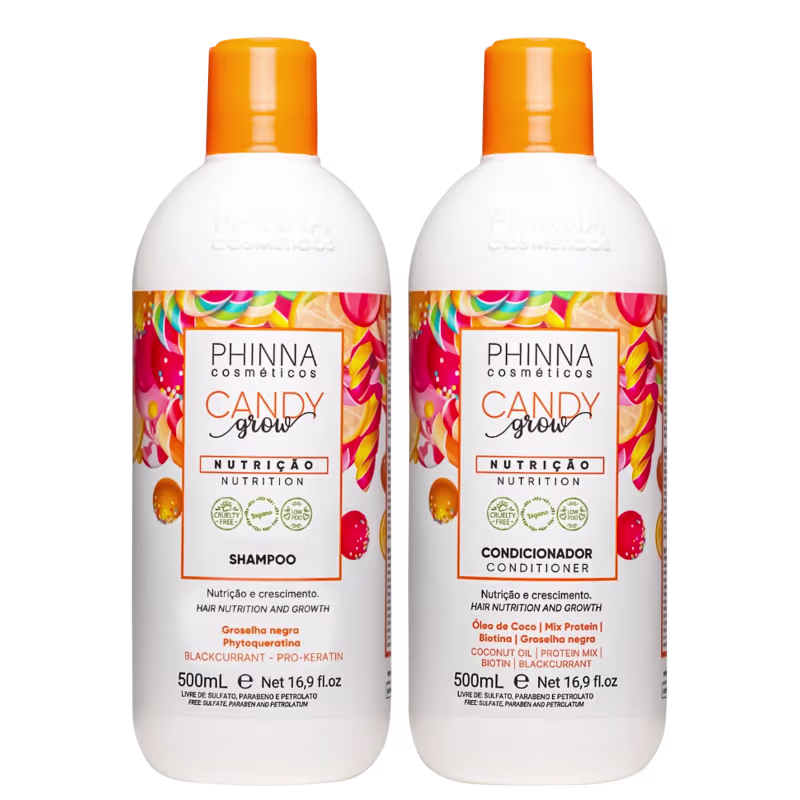 Kit com shampoo e condicionador para cabelos danificados. Phinna Cosméticos Candy Grow Home Care Duo promove nutrição e fortalecimento intenso.