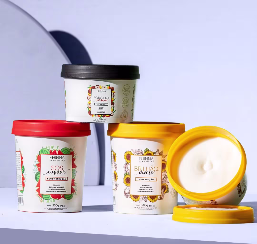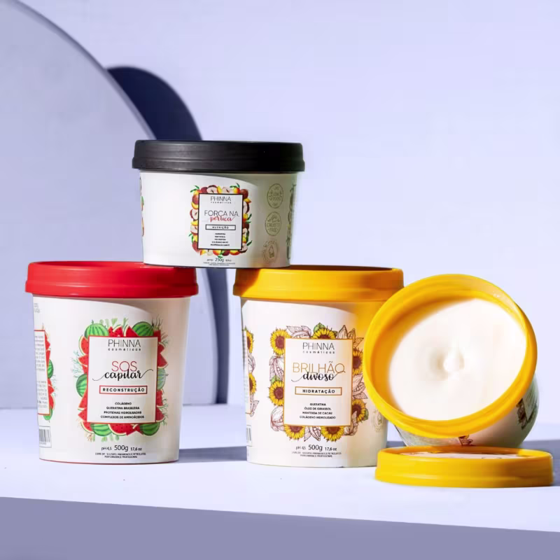 Phinna Cosméticos Brilhão Divoso - Máscara Capilar 500g: Desenvolvida especialmente para restaurar o brilho e a vitalidade dos cabelos secos e danificados. Elaborada com Manteiga de Cacau, Colágeno, Keratina, Pantenol e Óleo de Girasol , repara e alinha os fios, combate o frizz, proporciona máxima hidratação, desembaraço, sedosidade, maciez, brilho absoluto e deixa o cabelo disciplinado.