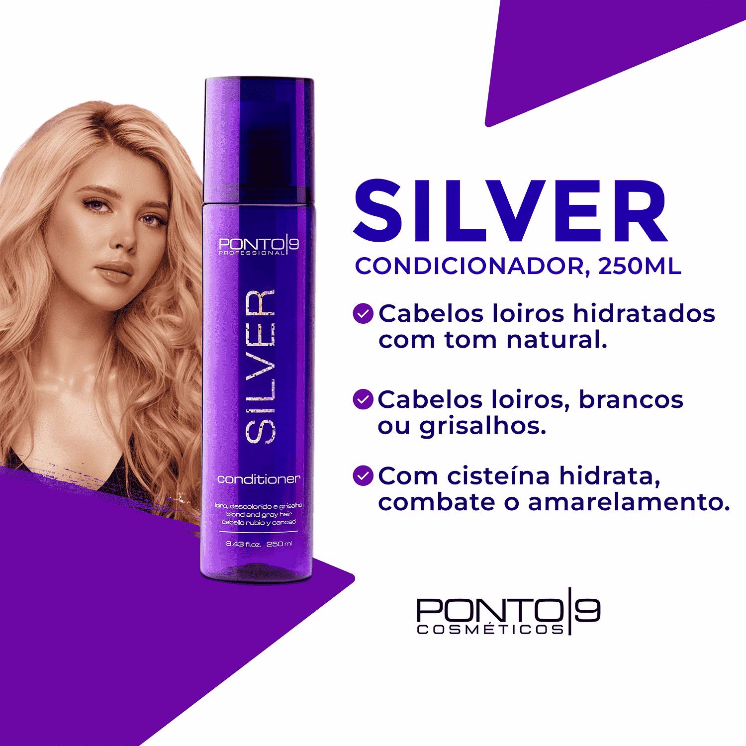 Ponto 9 Silver - Condicionador 250ml: sua fórmula com Cisteína hidrata, combate o amarelamento, promovendo brilho e sedosidade aos fios.