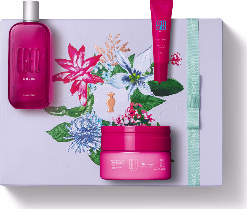 Não sei o CEPO Kit Presente Dia Das Mães Egeo Dolce traz a combinação icônica de Marshmallow, Sorvete de Framboesa, Algodão-Doce e Baunilha, ideal para quem quer se divertir e curtir todas as possibilidades com uma experiência completa: o toque aveludado do merengue mousse, o brilho natural do gloss labial e a fragrância açucarada do desodorante colônia. Todos os itens vêm em uma caixa florida que evidencia que o grande amor de mãe é algo transcendente e para retribuir, não seria apenas com uma flor, mas com um suntuoso bouquet: