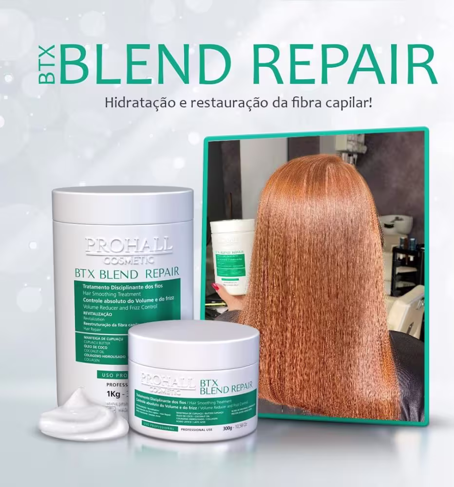Kit com botox capilar e máscara de tratamento. Prohall Cosmetic BTX Blend Repair + Extreme Repair, fórmula profissional que garante resultados incríveis aos fios.