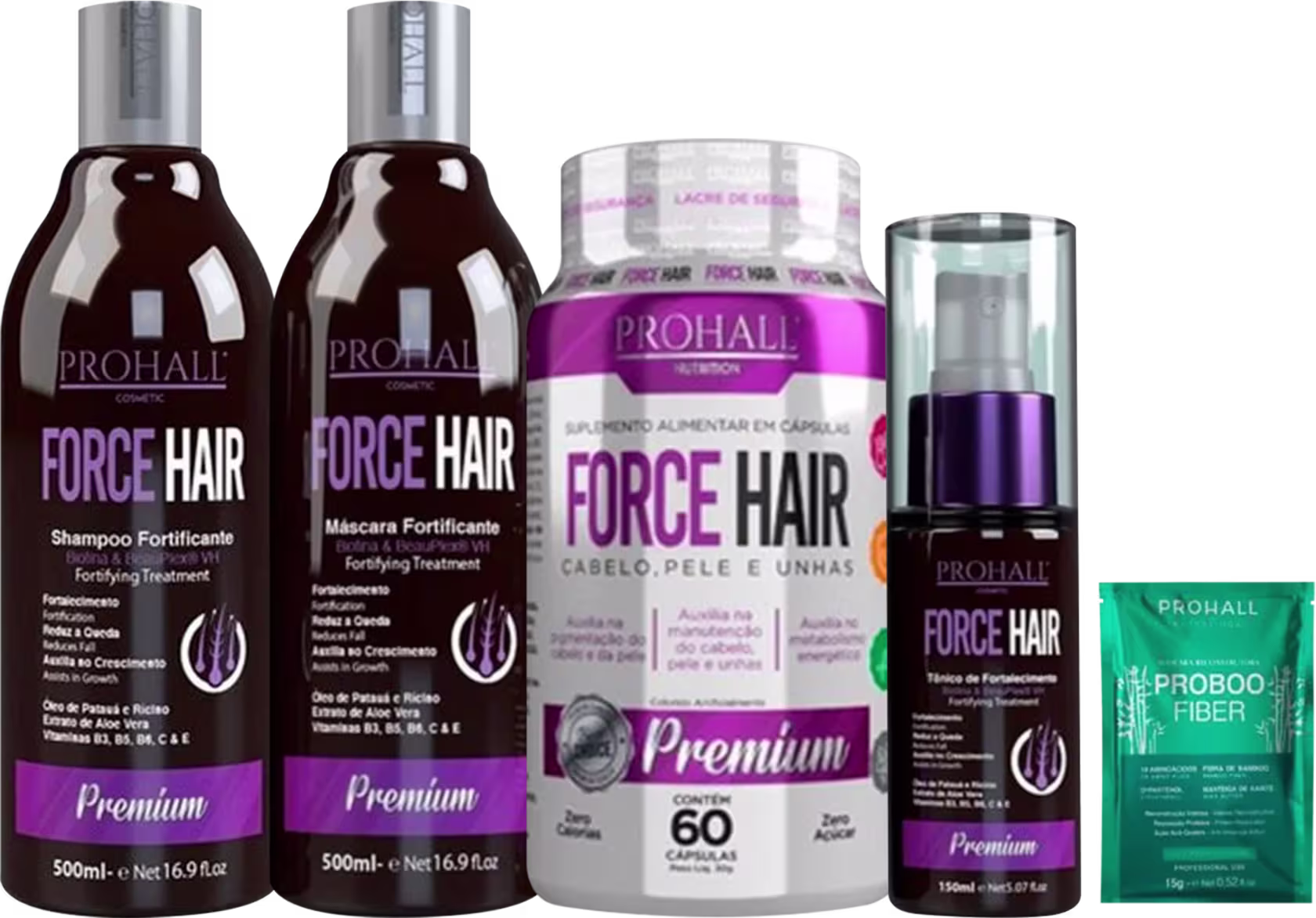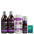 Kit de tratamento completo para cabelos danificados e fragilizados. Prohall Cosmetic Force Hair Crescimento Acelerado promove fortalecimento e auxilia no crescimento saudável dos fios.