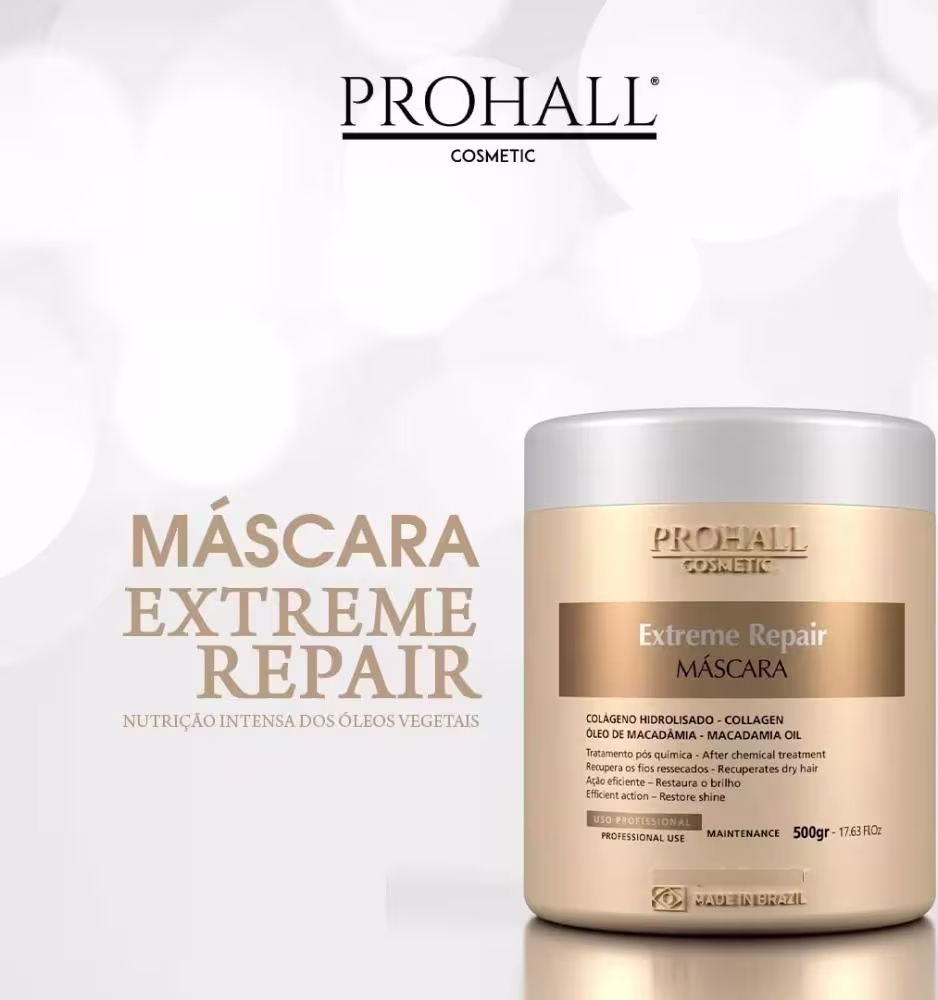 Prohall Cosmetic Extreme Repair - Máscara de Tratamento 500g: traz propriedades nutritivas que proporcionam hidratação intensa e fios mais macios. A tecnologia do produto atua como antioxidante, rejuvenescendo os cabelos. Sua fórmula destaca dois ingredientes principais: Colágeno Hidrolisado e Óleo de Macadâmia. Esses componentes restauram nutrientes e a umidade natural dos cabelos, fortalecendo os fios fragilizados.