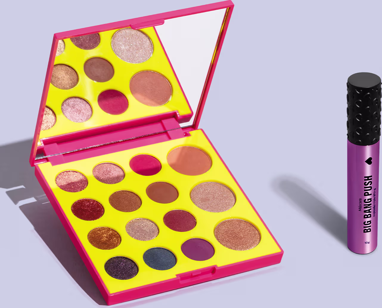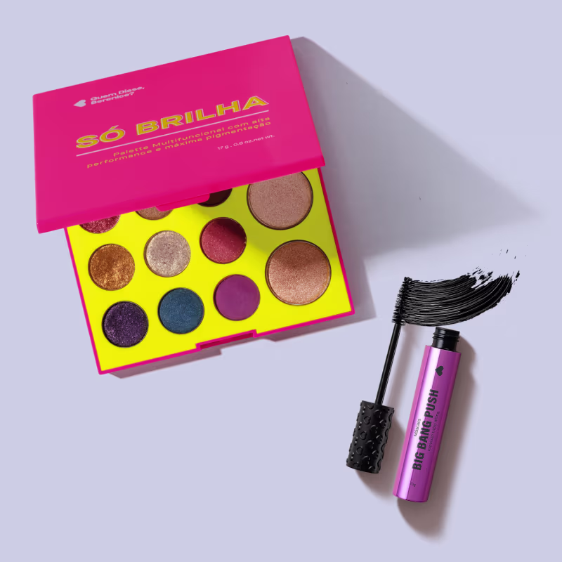 Kit com máscara de cílios e paleta de sombras. Quem Disse, Berenice? Make de Arrasar #1 vai deixar os seus cílios volumosos e seu olhar encantador para que você esteja sempre pronta para qualquer celebração, festa ou até para o trabalho, pois ele vai te ajudar a fazer uma produção de básica, até a mais arrasadora!