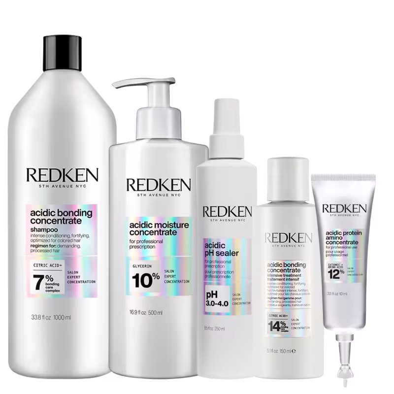O Kit Redken Acidic Bonding Concentrate Intense Treatment também proporciona condicionamento intenso e proteção contra o desbotamento da cor. Ele apresenta um tratamento em 5 etapas de um sistema de reparação de danos.