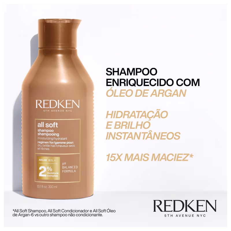 Redken All Soft - Shampoo 300ml: limpa delicadamente e promove hidratação profunda.