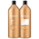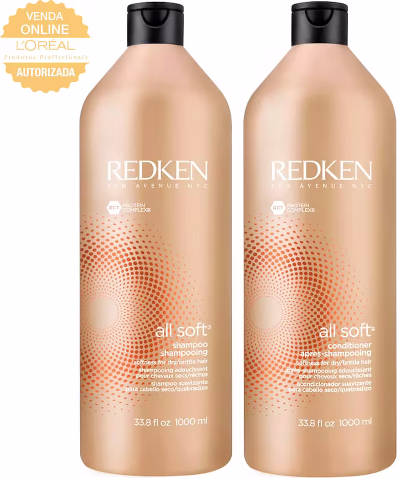 Kit com shampoo e condicionador, tamanhos profissionais, para cabelos secos, opacos e quebradiços. Redken All Soft Salon propotciona hidratação e reparação para fios mais fortes.