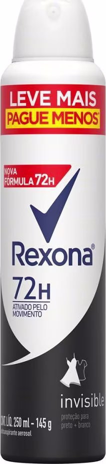 O Desodorante Aerosol Rexona Invisible 72h possui a tecnologia MotionSense, que libera proteção o dia todo. Indicado para mulheres que possuem uma rotina movimentada, seu uso oferece 72 horas de proteção contra a transpiração excessiva, controlando o suor e prevenindo o mau odor.