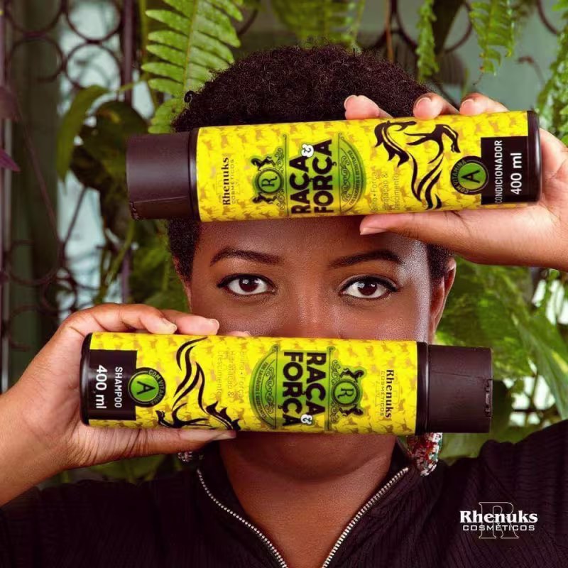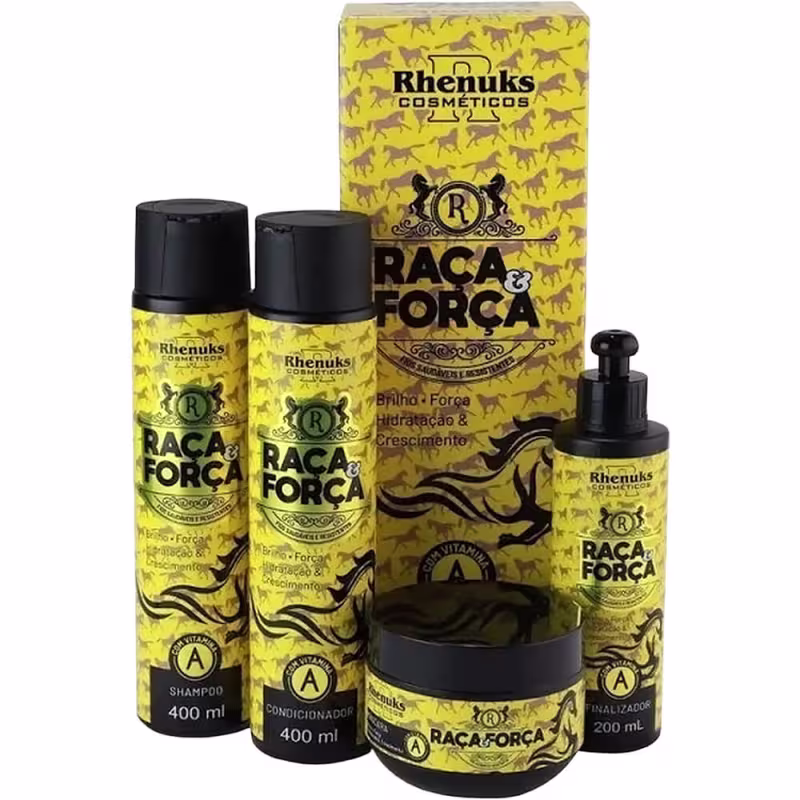 Kit de tratamento para todos os tipos de cabelos. Rhenuks Raça e Força entrega hidratação e crescimento estimulado com Vitamina A nos fios.