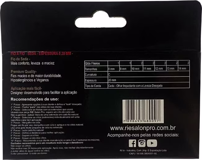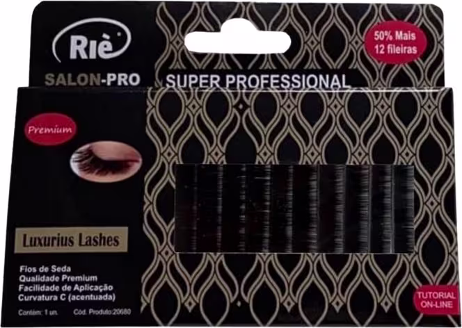 O Kit RIÈ salon-pro Fio a Fio Luxurius Lashes Fios de Seda possui um total de 12 fileiras de comprimento que variam de 8 a 15mm e largura de 20mm. Fios macios e de maior durabilidade, hipoalergênicos e veganos.
