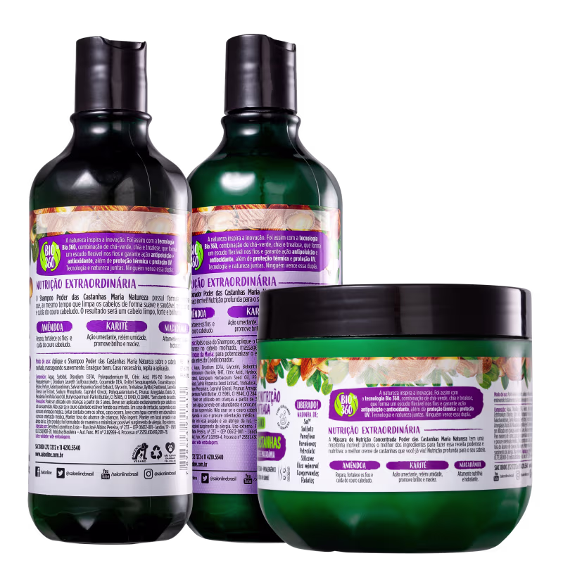 O Kit Salon Line Maria Natureza Poder das Castanhas Trio oferece um cuidado natural que repara e fortalece a fibra capilar. Os ativos retêm a umidade dentro do fio e protegem das agressões externas.