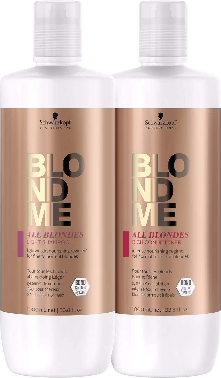 Kit com shampoo e condicionador para cabelos loiros. Schwarzkopf Professional BlondMe Suave + Enriquecido Salon Duo promove limpeza suave, nutrição e brilho para os fios.