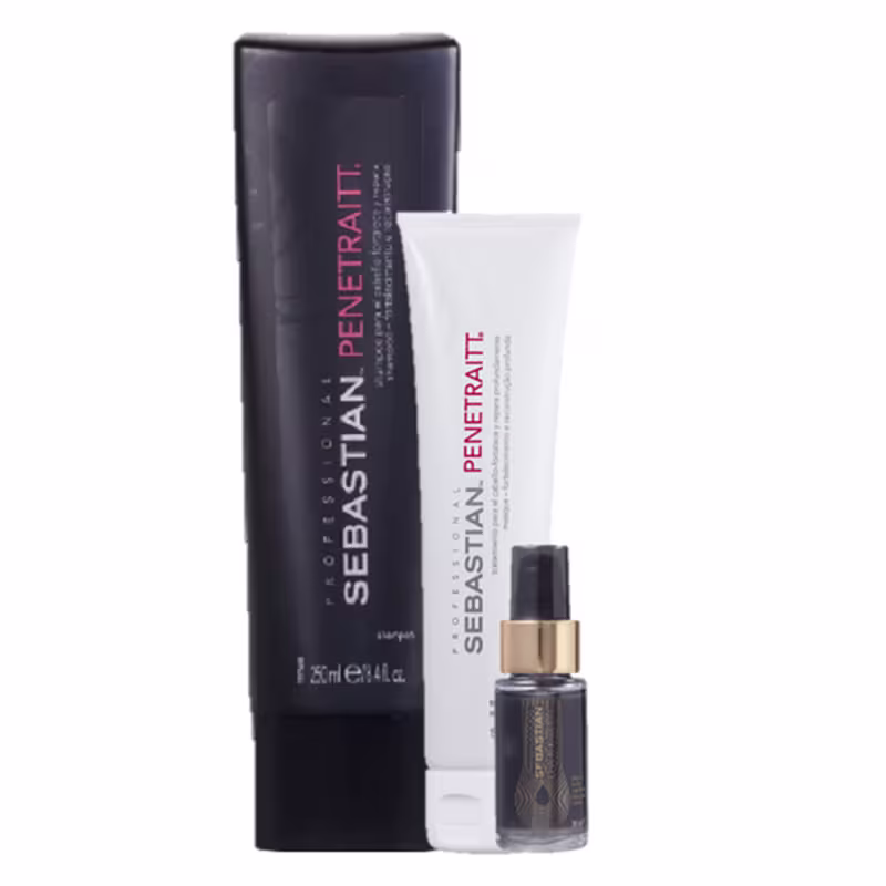 Kit com shampoo, máscara e óleo capilar para cabelos danificados. Kit Sebastian Professional Penetraitt + Dark Oil Basic Up Trio oferece reconstrução total dos fios.