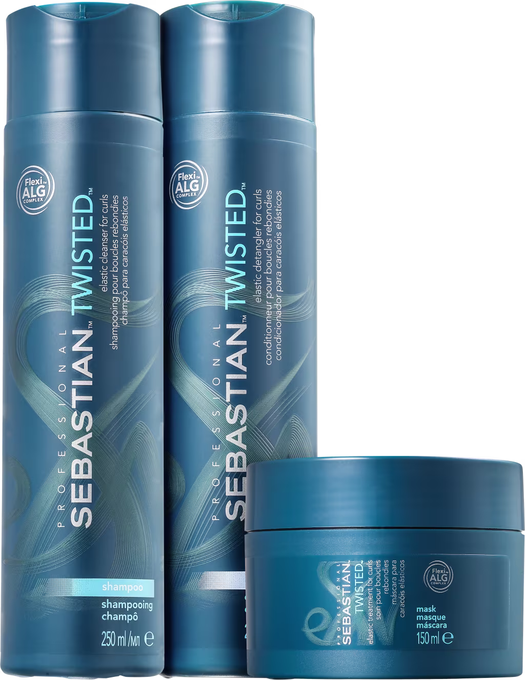 Kit de tratamento para cabelos cacheados e ondulados. Kit Sebastian Professional Twisted Elastic Trio fortalece, define, nutre e controla o frizz durante o cuidado diário.