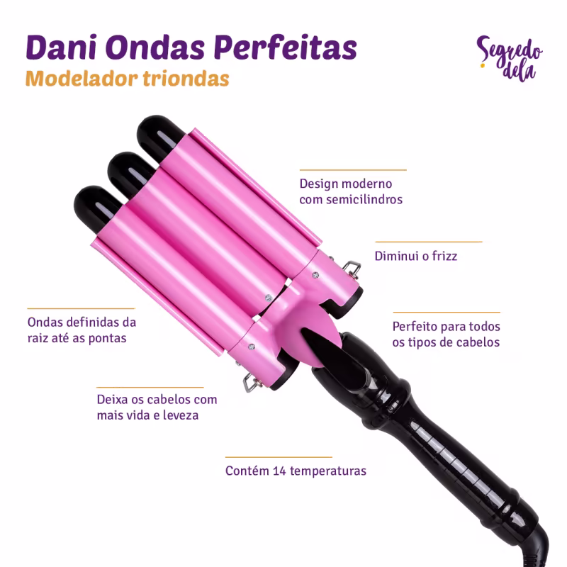 Segredo Dela Dani Ondas Perfeitas 25mm - Modelador Triondas: possui design moderno com três semicilindros de 25mm, que pressionados sobre os fios, formam ondas bem definidas. Revestimento cerâmico e uma exclusiva tecnologia que emite íons, reduzindo o frizz dos cabelos.