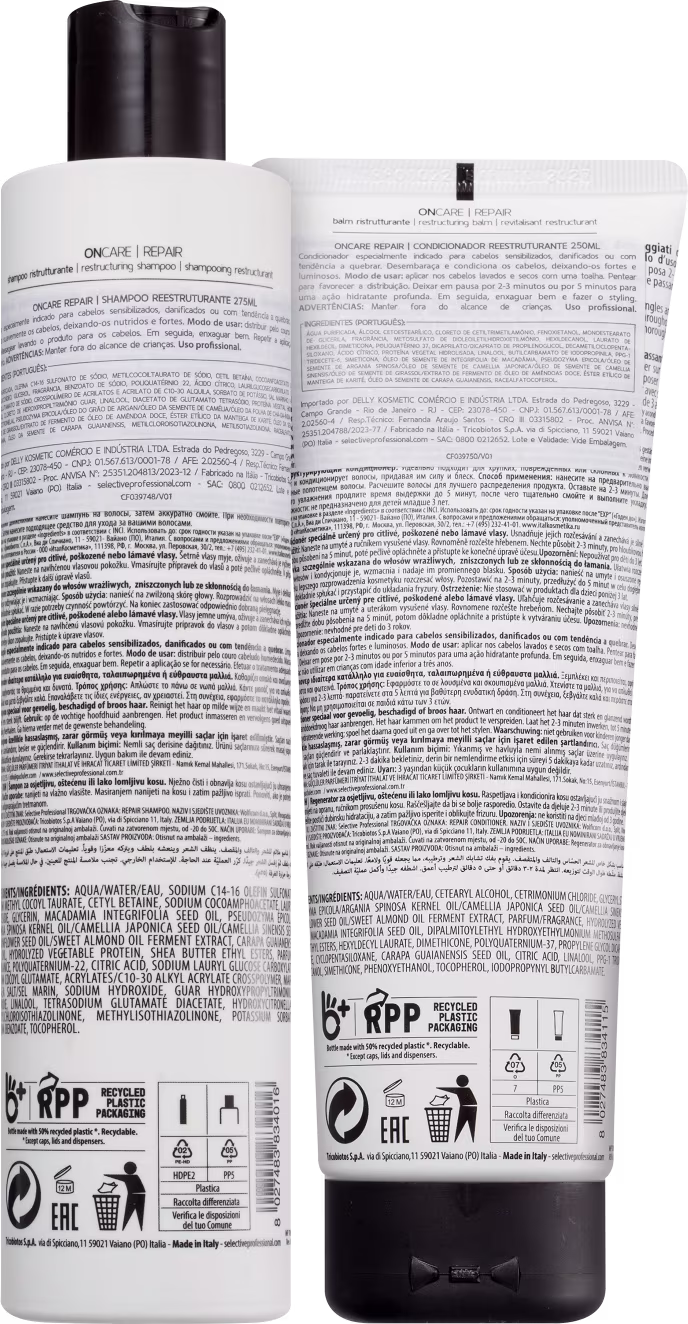 Kit com shampoo e condicionador para cabelos sensibilizados, danificados e quebradiços. Selective Professional On Care Repair nutre profundamente e devolve a força aos fios.
