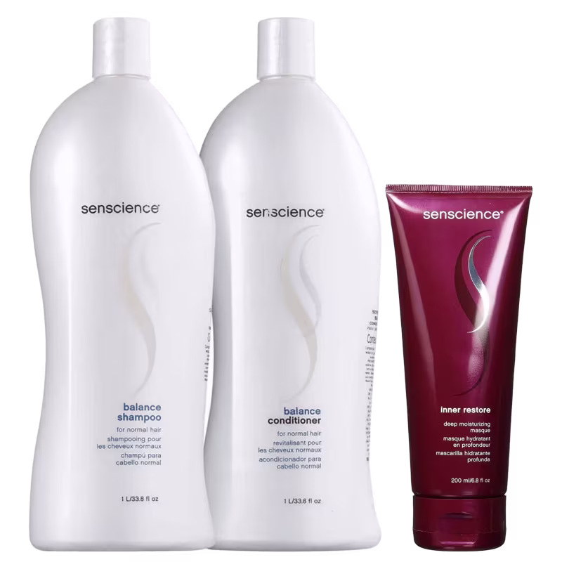 Não sei o CEPKit de tratamento para cabelos normais. Senscience Balance Inner Restore limpa e condiciona, equilibrando a saúde e a hidratação dos fios.