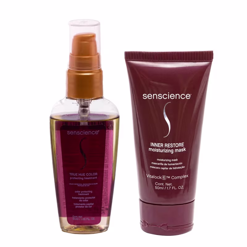 Kit com sérum e máscara para cabelos coloridos e danificados. Senscience True Hue Color Inner Restore restaura, fortalece e hidrata enquanto preserva a cor.