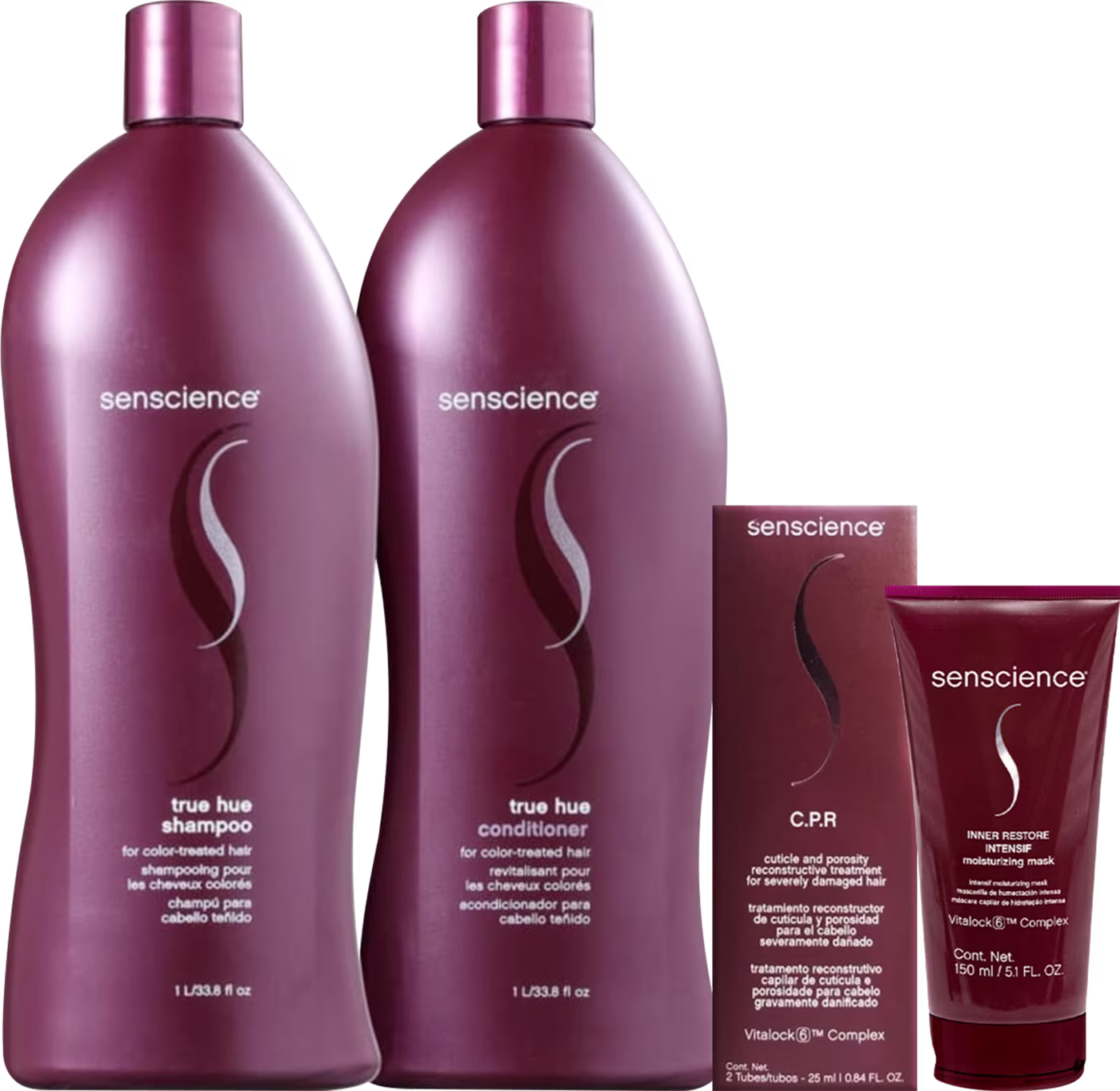 O Kit Senscience True Hue + Inner Restore Intensif Moisturizing Mask + CPR limpa, condiciona, desembaraça e preserva a tonalidade e o brilho da cor por muito mais tempo. Sua fórmula tecnológica deixa os fios hidratados de maneira suave e faz com que sua visita ao cabeleireiro seja menos frequente, já que protege do desbotamento.