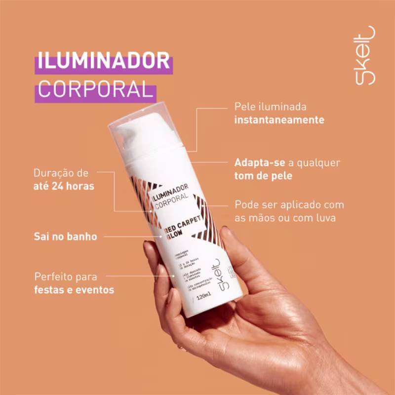 Skelt Red Carpet Glow - Iluminador Corporal 120ml: proporciona uma cor bronzeada e radiante em poucos minutos. Promove efeito que valoriza as áreas com definição muscular e disfarça a aparência de estrias e celulites.