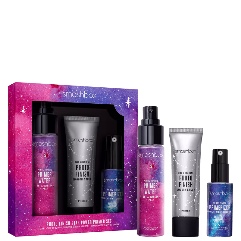Kit de maquiagem com 3 primers best-sellers em tamanho viagem. Kit Smashbox Photo Finish Star Power é perfeito para uma pele impecável e make duradoura.