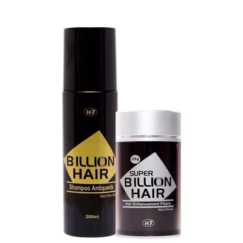 O Kit Super Billion Hair Shampoo + Fibra Capilar Castanho Claro combina o shampoo antiqueda, que nutre e fortalece o cabelo, prevenindo a queda, com o finalizador capilar, um complexo orgânico de fibras de queratina em forma de pó seco. O finalizador adere eletrostaticamente aos fios, simulando as características do cabelo humano e proporcionando volume imediato às áreas ralas, criando uma aparência natural e uniforme.