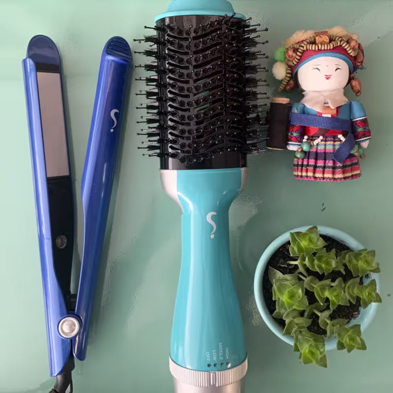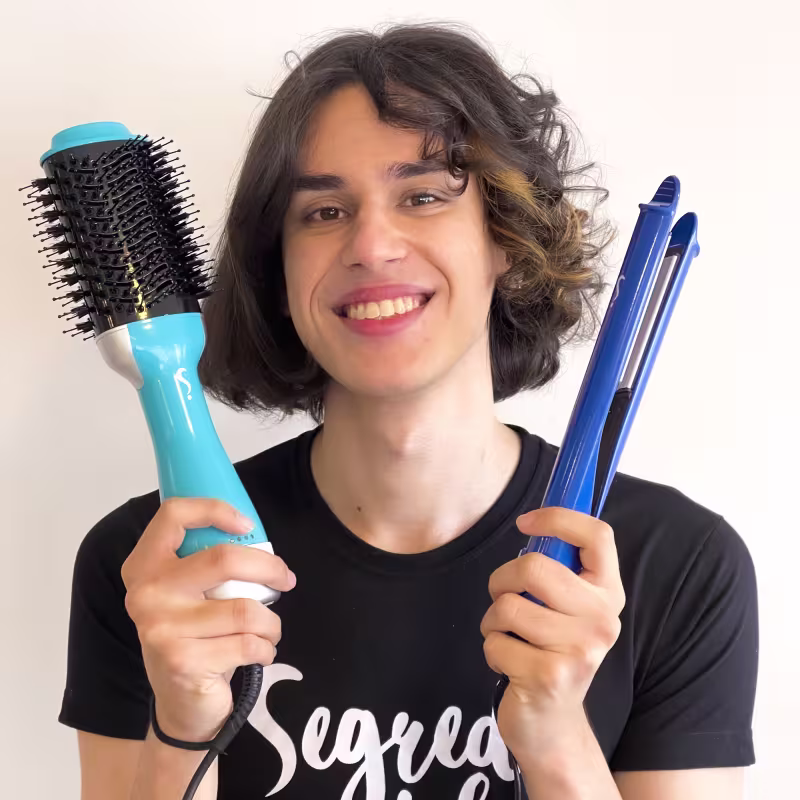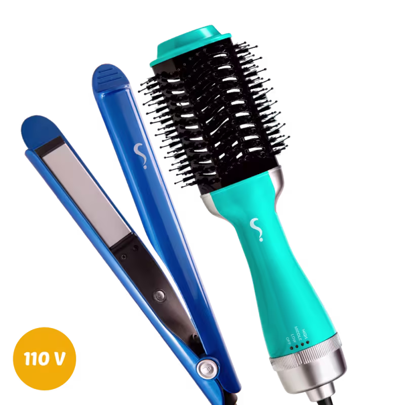 Kit com escova secadora 110V e chapinha 2 em 1. O Kit Super Versátil Duo seca, alisa e modela fios e cachos com eficiência e praticidade.