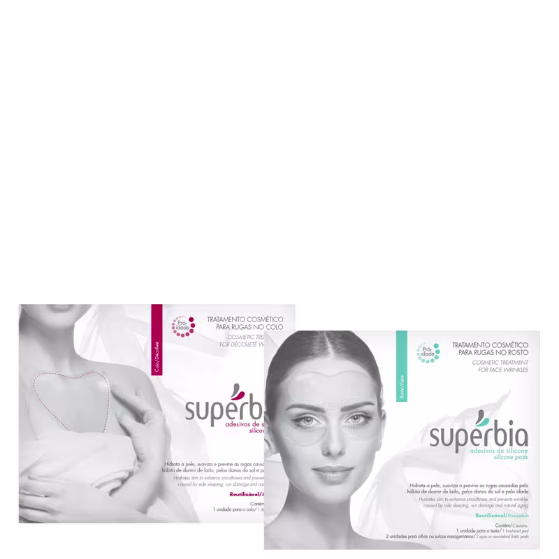Supérbia Adesivos de Silicone Rosto - Tratamento Redutor de Linhas (3 Unidades): traz um formato para ser colocado na testa e outro para abaixo dos olhos. Reutilizáveis, sua textura maleável é confortável durante o uso. Sua ação potencialmente hidratante reduz as rugas causadas pelo hábito de dormir de lado, exposição ao sol ou pela idade.