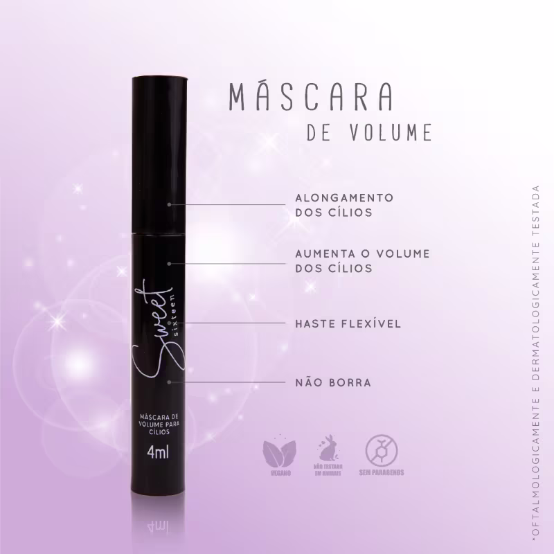 Sweet Sixteen - Máscara de Cílios 4ml: proporciona um efeito incrível deixando o olhar mais marcante. Além de dar mais volume para os cílios, ela também alonga.