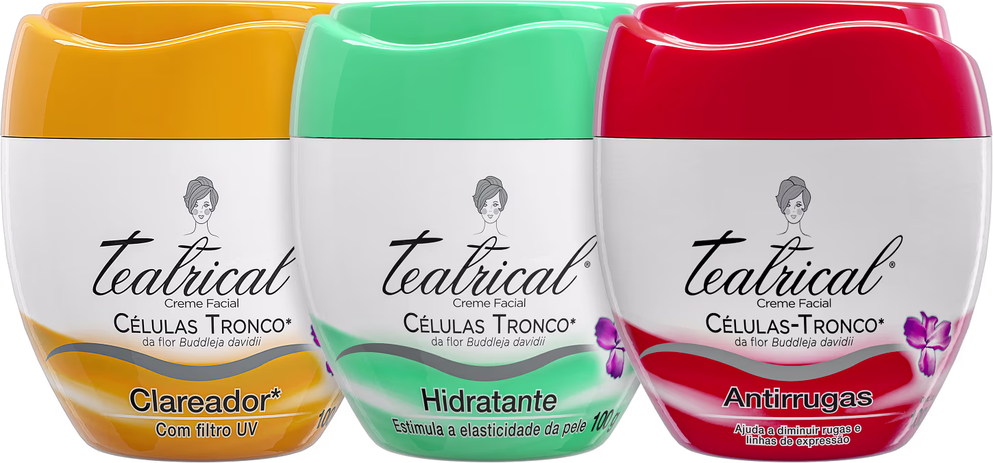 Kit com 3 cremes faciais para todos os tipos de pele. Teatrical Células Tronco Facial Completo hidrata, uniformiza o tom e minimiza os sinais da idade.