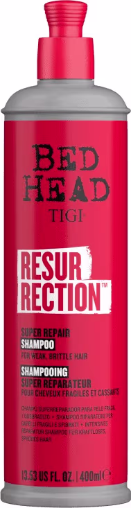 TIGI Bed Head Resurrection - Shampoo 400ml: apresenta uma fórmula reparadora poderosa, repleta de ativos revitalizantes e fortalecedores, que permitem deixar os cabelos danificados com mais elasticidade, suavidade e aparência saudável.